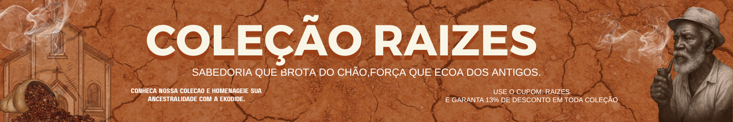 Inspirada nos Pretos e Pretas Velhas, essa coleção é um mergulho na sabedoria ancestral que cura com silêncio, com riso manso, com chá e reza. É homenagem aos que vieram antes, aos que mesmo com os pés feridos, deixaram caminhos firmes. Raízes que não se veem, mas sustentam. Palavra que não se grita, mas transforma. Essa coleção é nosso gesto de reverência. De pé no chão, com a cabeça erguida, seguimos honrando a força que nos trouxe até aqui.